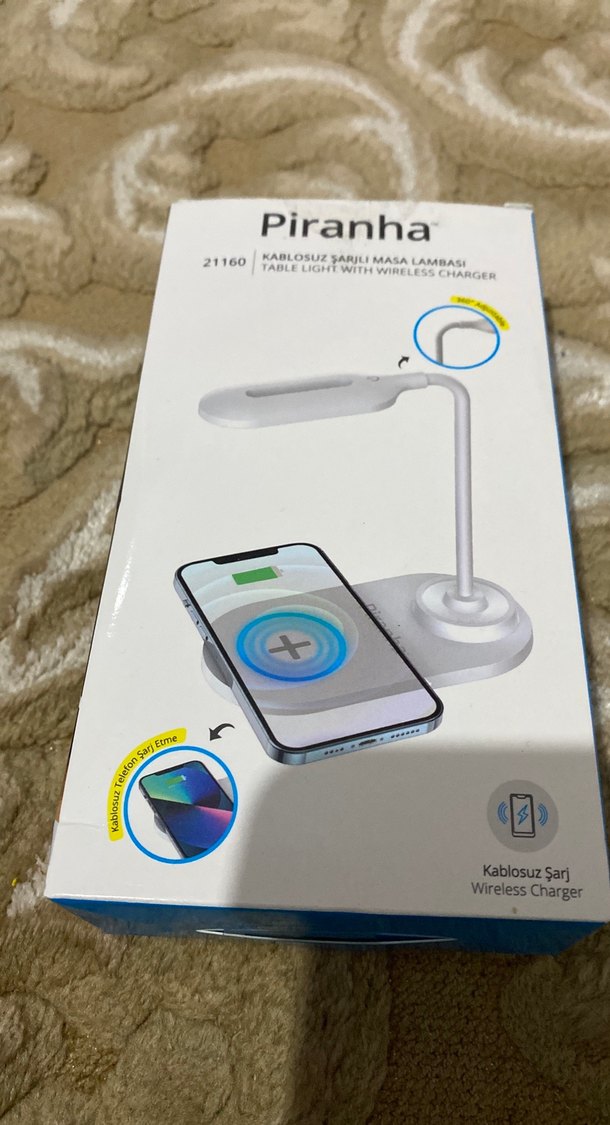 Beyaz Piranha masa lambası, uyumlu telefonlar için kablosuz şarj özelliği sunar, aydınlatma ve şarjı bir arada sağlar.