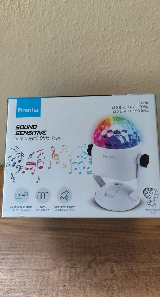 Piranha LED ışıklı diskotopu sese duyarlı olup 30 m² alanda renkli ışık efektleri oluşturur. 3 AAA pil veya USB ile çalışır.