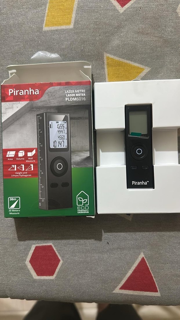 Sıfır üründür. Piranha PLDM6016 lazer mesafe ölçer, uzunluk, alan ve hacim ölçümü yapar. Dijital ekranlı, 30 metre ölçüm menzeline sahiptir. Pazarlık yapılır.