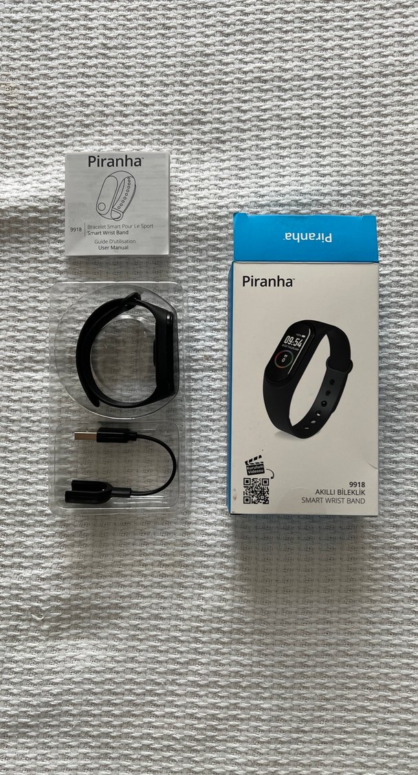 Piranha marka siyah renkli akıllı bileklik, şarj kablosu ve kullanım kılavuzu ile birlikte gelir. Fitness takibi ve bildirim özelliklerine sahiptir. ⌚