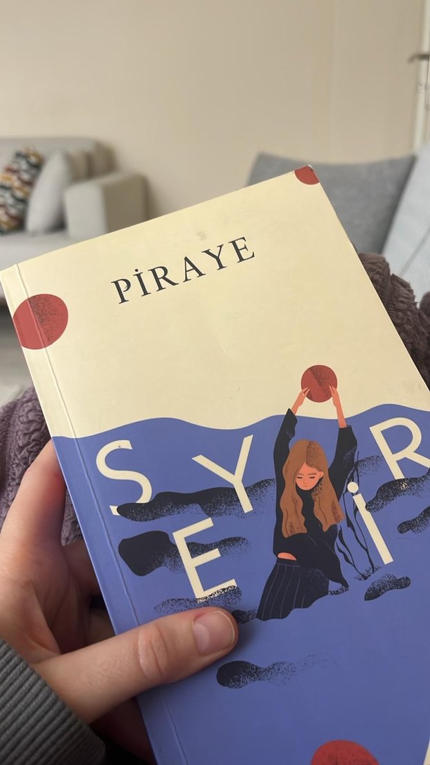 "Piraye" adlı roman, bej ve mavi zemin üzerinde yukarıya uzanan bir kadını gösteren kapak illüstrasyonuna sahiptir.