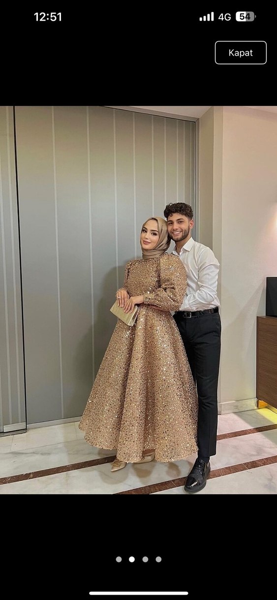 Altın rengi, uzun kollu ve pırıltılı nişan elbisesi. Modern klasik tarzda, modest kesim ve yakası kesimli. Uzun boy ve desensiz. Arkası ipli 36/40 beden uyumludur Kiralık 1.500₺