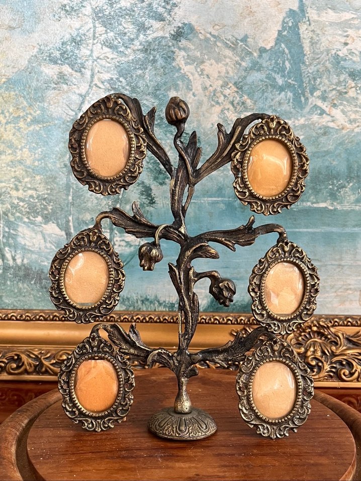 Altın renkli, ağaç şeklinde tasarlanmış, altı oval fotoğraf tutucu ve detaylı süslemelere sahip dekoratif çerçeve.