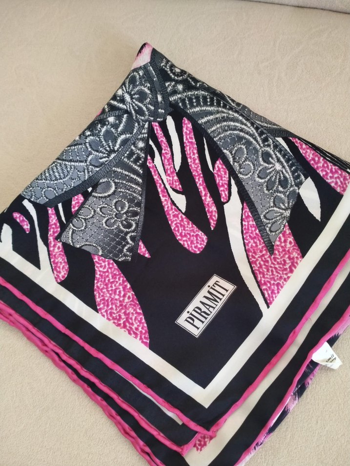 Kadınlar için ipek görünümlü, koyu pembe renkli, bohem desenli eşarp Retro ve hippie tarzlarıyla uyumlu, renkli bir dokunuş sağlar.