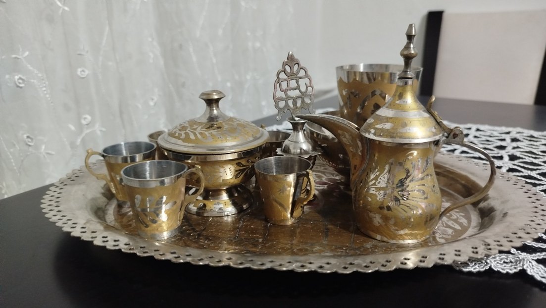 pirinç ve gümüş olup el işçiliği fotolarda bellı 80 senesınden dayanıyor tahmınım ürünüm 12 parçadan oluşuyor yıllardr duruyor olece oyuDen hafıf kararma mevcut sürahisı tepsisi asırı agır nadır bulunan set