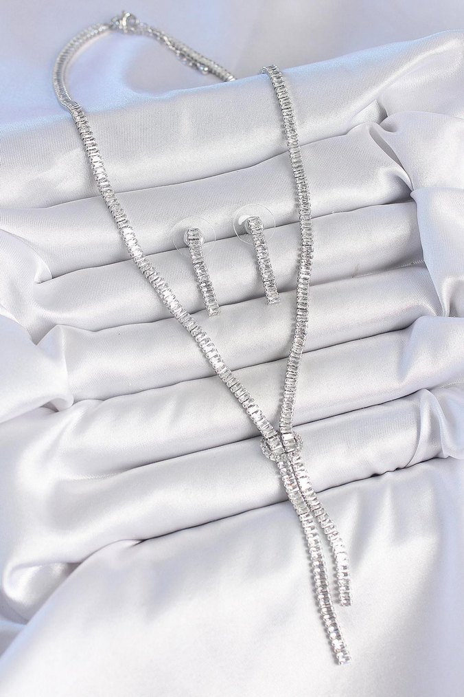 Pirinç Gümüş Renk Su Yolu Zirkon Taşlı VIP Seri Kadın Kolye Seti