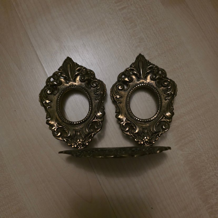 Pirinç İkili Çerçeve Oldukça eskidir. Çerçeveler hareket edebilmektedir. Koyu altın renginde, küçük oval fotoğraflar veya sanat eserleri için detaylı vintage tarzda dekoratif çerçeveler. ️