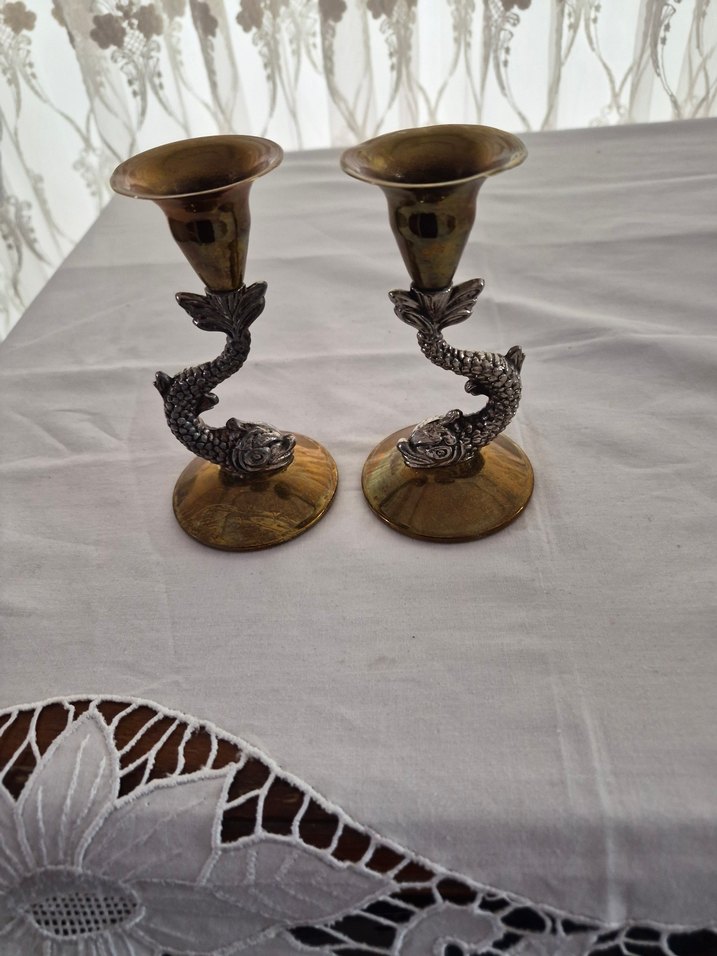 pirinç balık figürlü detaylı saplara sahip çift şamdan seti. ️