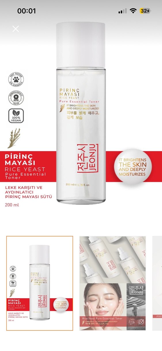 Pirinc mayası içeren bu toner, cildi aydınlatır ve derinlemesine nemlendirir. Leke karşıtı ve cilt tonunu eşitler. 200 ml. 11 ekim tarihinde alındı paketi hiç açılmadı.
