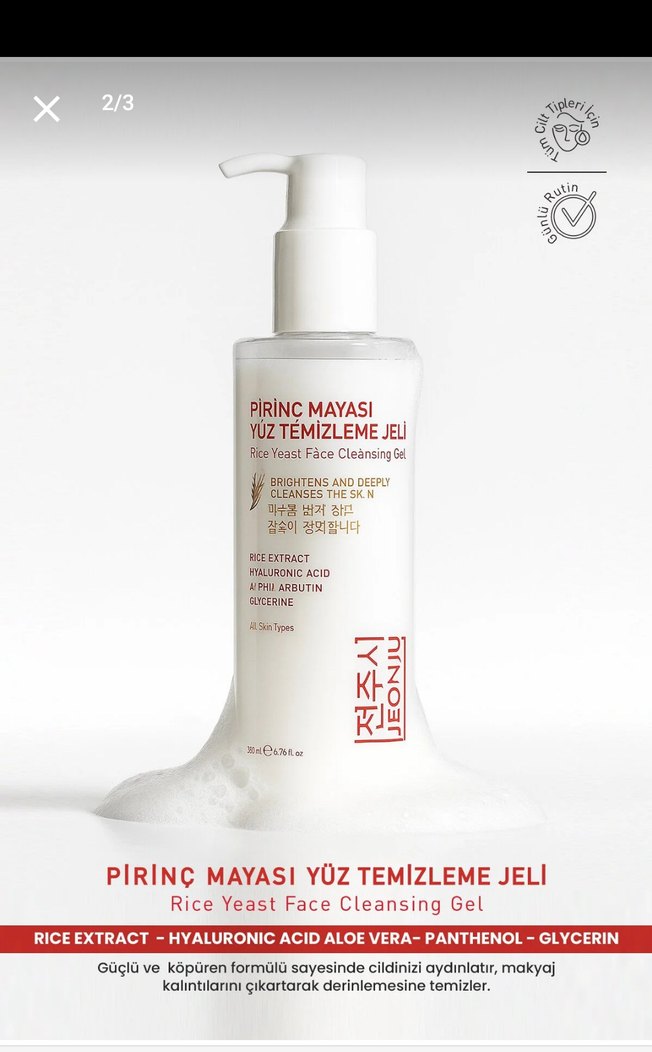 Pirinç mayası, hyaluronik asit, aloe vera, panthenol ve gliserin içeren yüz temizleme jeli cildi aydınlatır ve derinlemesine temizler.