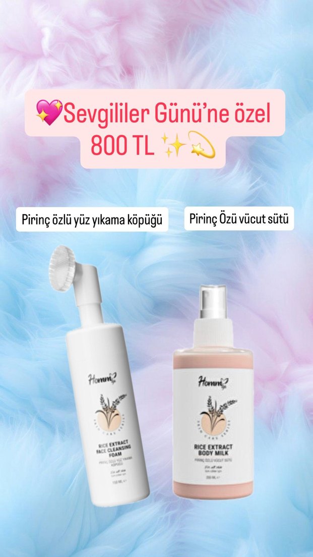 Sevgililer Günü'ne özel 800 TL fiyatla pirinç özlü yüz yıkama köpüğü ve vücut sütü seti.