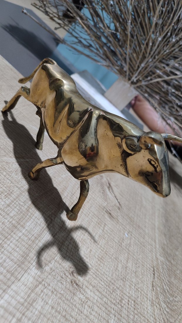 Parlak altın renkte, dinamik pozisyonda boğa figürü. Pürüzsüz detaylarla işlenmiş, etli oldukça ağır PİRİNÇ malzemeden üretim ölçüler fotoğraf paylaştım Aynı gün özenli kargo