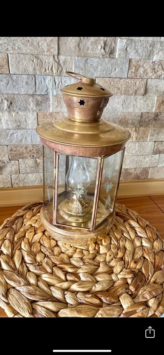 Pirinç dekoratif fener, cam paneller ve kapakta yıldız şeklinde kesimlere sahiptir. Sıcak, ortam aydınlatması sağlar. ️boy 32 en 47 fitilli