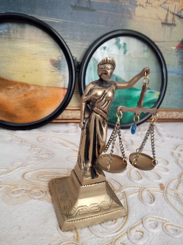 Parlak altın renkli bu figür, adaleti simgeleyen teraziyi temsil eder. Detaylı bir tabana ve parlak bir yüzeye sahiptir. ⚖️