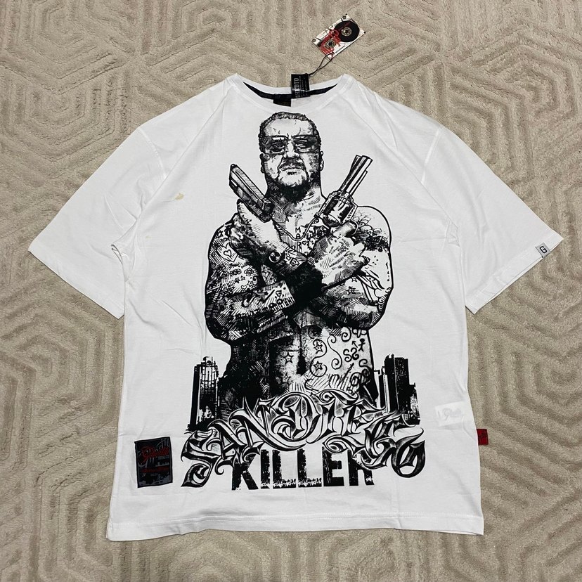 Pamuklu, kısa kollu, bol kesim beyaz tişört. Koyu baskılı dövmeli adam grafiği ve bisiklet yaka detayları bulunur. Günlük kullanıma uygun.