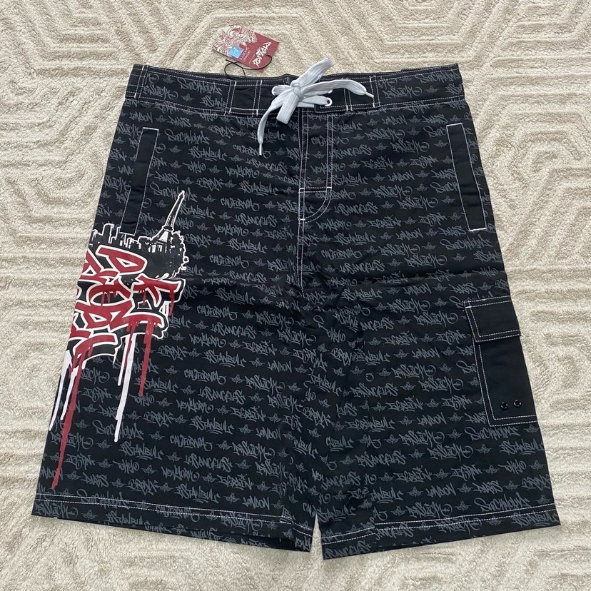 Siyah baskılı, bol kesim ve kemerli erkek yüzme şortu. Midi boy, sokak tarzı ve rock punk havası taşır. Plaj için uygundur. ️