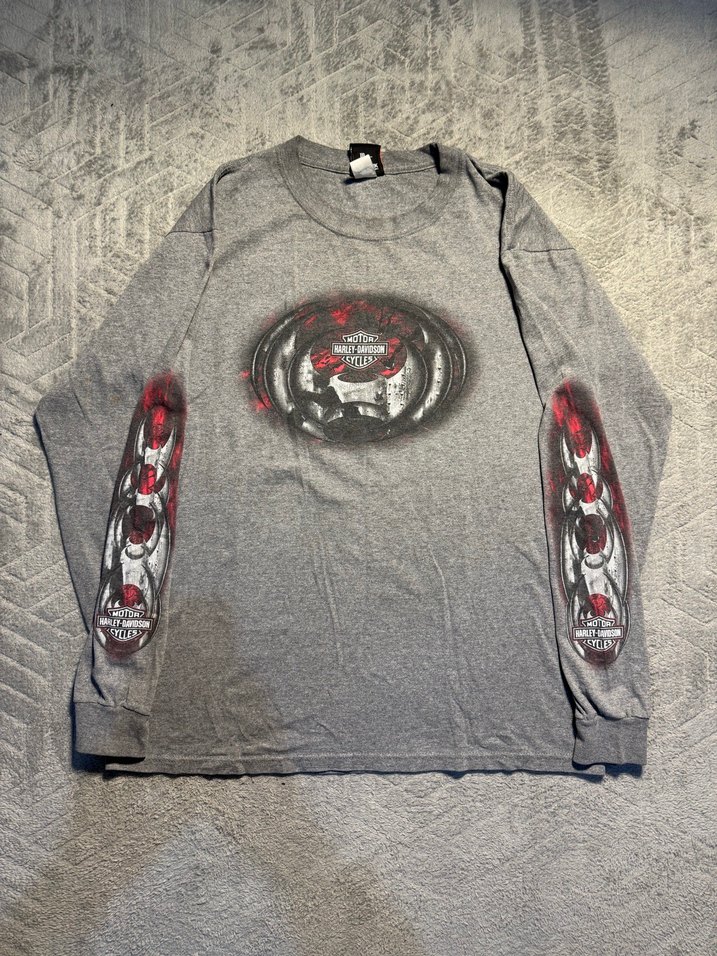 Pamuk kumaştan yapılmış, uzun kollu ve yuvarlak yakalı gri erkek tişört. Ön ve kollarda baskılı desenler, bol kesim ve düğmeli detaylara sahip. Günlük kullanıma uygun grunge punk tarzı.