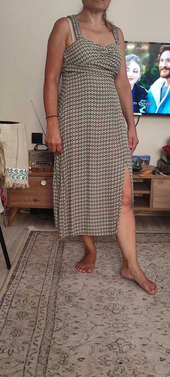 Kahverengi ve gri puantiye desenli, bol kesim elbise yumuşak kumaştan, günlük kullanım için uygun.