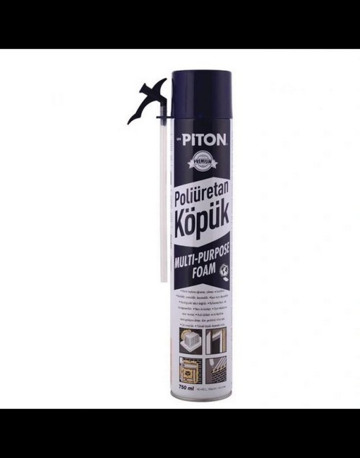 Piton çok amaçlı poliüretan köpük, 750 ml sprey kutuda. Hassas kullanım için uygulama başlığıyla birlikte gelir.