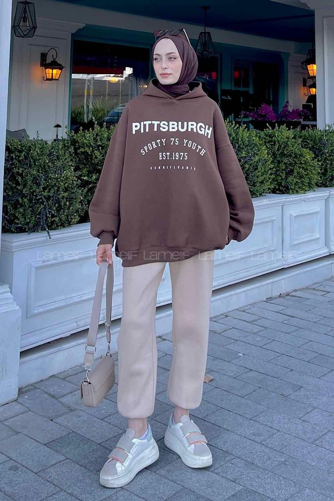 Pittsburgh baskılı, uzun kollu, bisiklet yaka, bol kesim kahverengi sweatshirt. Yumuşak ve sıcak kumaştan, kabarık detaylı.