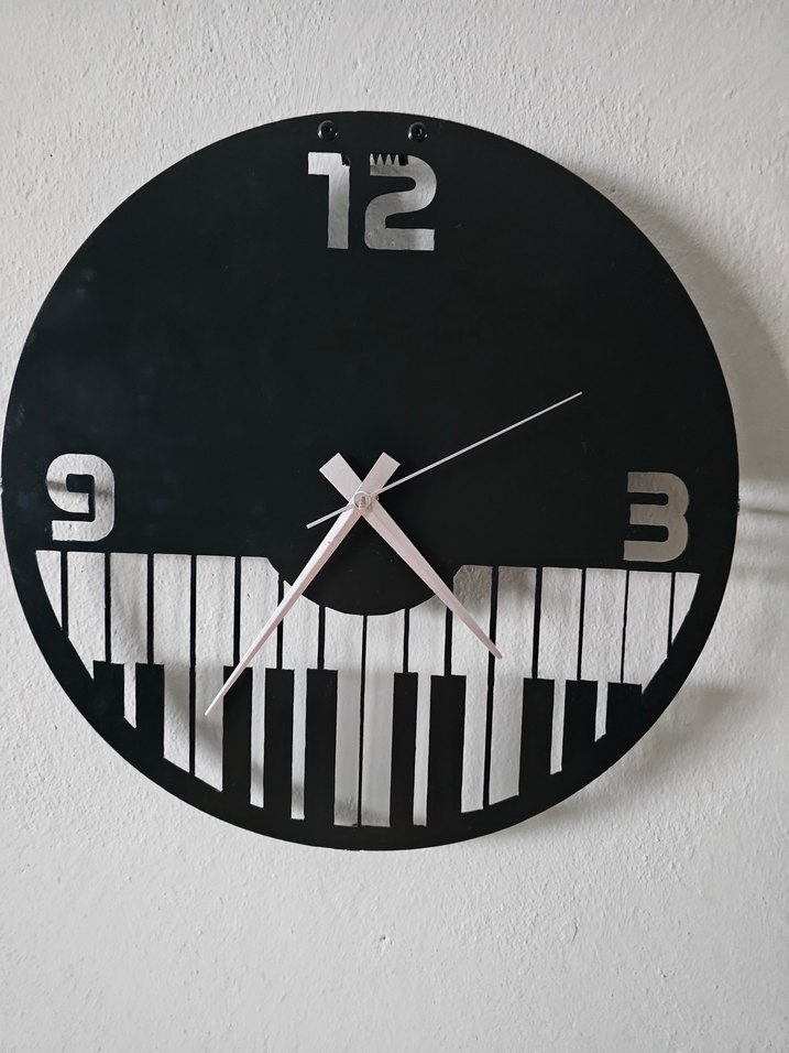 Bu siyah duvar saati, piyano tuşları tasarımı ve 12, 3, 9 rakamları ile dikkat çeker. Beyaz akrep ve yelkovanlıdır.