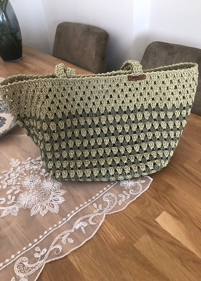 Kağıt ip ile örülmüş çıtçıtlı içi geniş oldukça kullanışlı hem plajda hemde günlük kullanılabilir çanta en 48 boy 28 taban genişliği 27 cm’dir