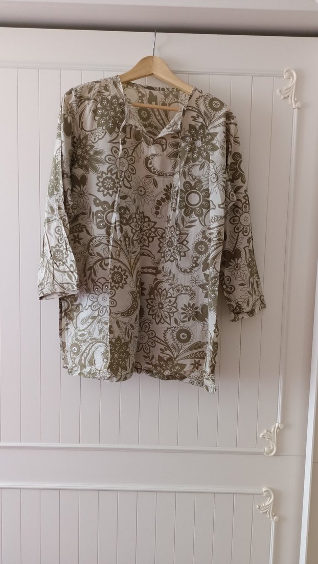 Gri ve bej tie-dye desenli, uzun kollu, bol kesim ve keten kumaştan bohem plaj elbisesi yan tarafında ufak dikilmesi gereken bir yer mevcut çok belli olmuyor