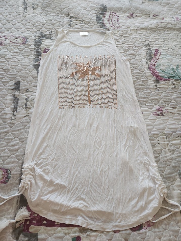 Kolsuz, bol kesim, uzun boy, açık beyaz renkte nakışlı plaj elbisesi.