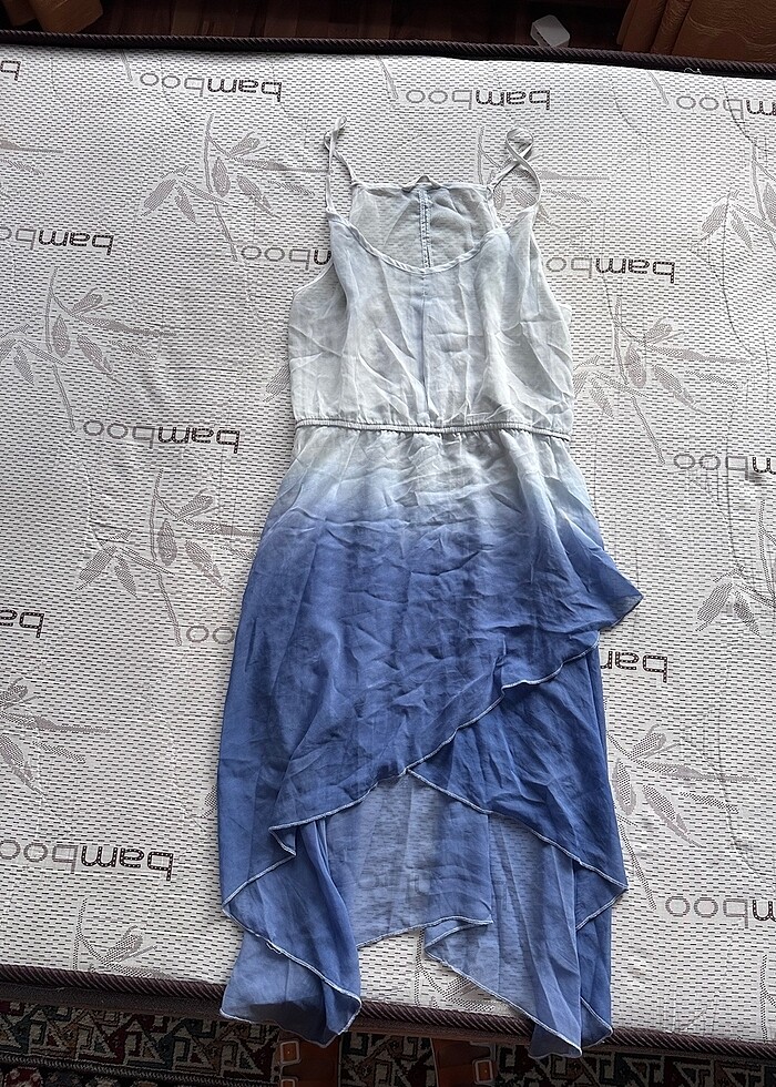 Mavi,beyaz transparan plaj elbisesi. Arkası özellikle transparan direkt mayo/bikinix belli oluyor. Ama çok rahat ve yumuşak bir elbise.