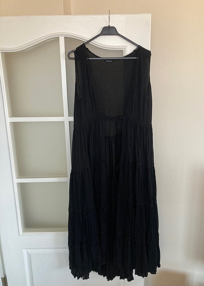Önü bağcıklı uzun siyah plaj elbisesi hiç giyilmeyen ürünlerden trendyoldan alındı etiketinde trendyol yazıyor