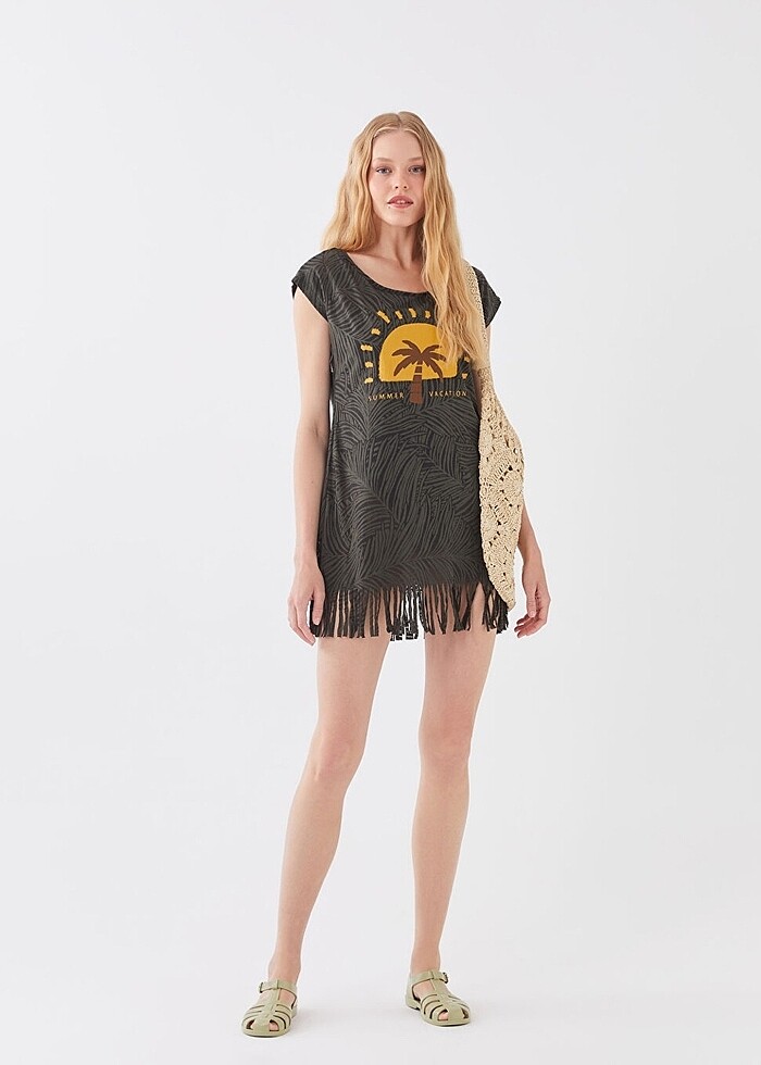 Plaj elbisesi. Görseldekiyle aynı sadece baskısı farklı, aynı baskılı görseli bulamadım. Pamuklu kumaştan, hafif kayık yaka çok güzel bir ürün. Aynısının siyah rengi de dolabımda mevcut. Her hangi bir sorunu yok. Yeni haliyle aynı durumda