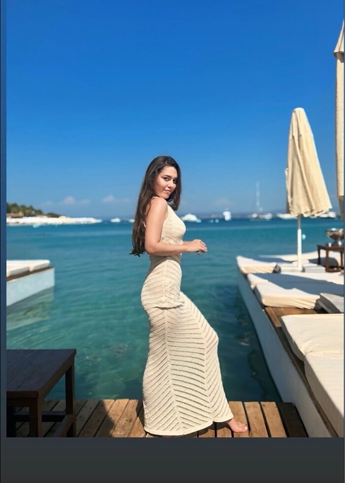 Örgü plaj elbisesi bej krem renk açık Yunanistandan almıştım mykonosta bir butikten S. M uygundur