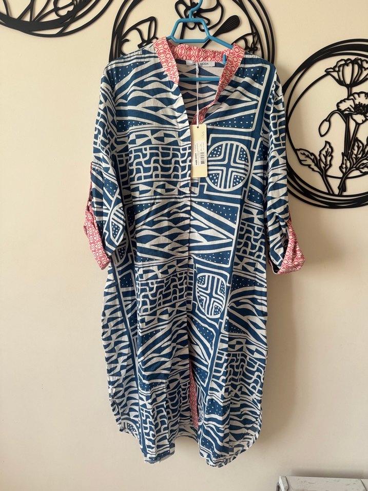 bol kesim elbise, renkli mavi batik deseni, yüksek yaka ve uzun kollu. Drapeli tasarımıyla bohem tarzı yansıtıyor. Plaj elbisesi sıfır hiç kullanılmamıştır L-XL uyumludur