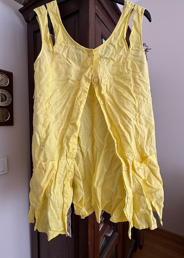 %100 keten elbise. 36 38 beden uyumlu. Kanarya sarısı. Cepli. Önden düğmeli. Arka askı bandında görünür görünmez minik bir leke var o yüzden fiyatı düşük tutuldu. İki kol arası 46 cm. Diz üstü