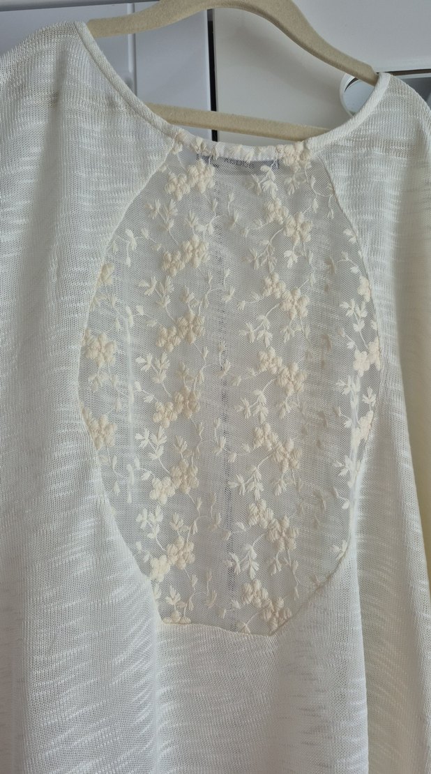 Kirik beyaz renk, yarasa kol,kisa kesim bikini/mayo üstü panco. Sirt kismi dantelli. Minimalist bohem tarzda, günlük kullanım için de uygun. Standart Beden fakat 38-42 olarak belirtmek daha dogru. Sadece 1 kez giyildi.