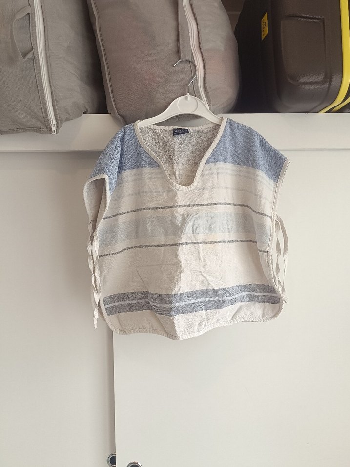 Yumuşak keten kumaştan, kolsuz, bol kesim ve V yakalı çocuk poncho havlu. Örgü dokusu ve gri beyaz tonlarında hafif batik desenlidir.