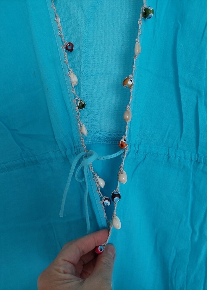 Mavi pareo. M ve L bedenlere uygundur. İki koltuk altı mesafesi 50cm, boyu 89cm. 1 ya da 2 kez kullanildi