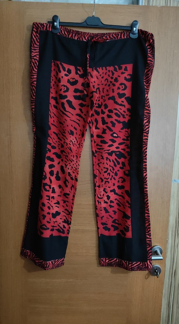 Plaj pantolonu ince tül kumaş kırmızı siyah leopar desenli standart beden belden büzgülü bağcıklı 36- 38-40 bedene rahat olur