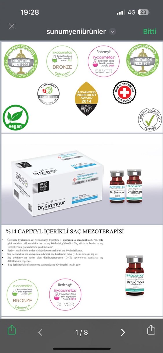 Dr.Siamour saç mezoterapisi serumunda %14 Capixyl, Redensyl ve vegan içerikler bulunur. Saç büyümesini destekler, dökülmeyi azaltır, dermatolojik olarak test edilmiştir. İsviçreli bilim adamlarının 10 yılda geliştirdiği formül Swiss ice ve somon DNA sı ikisi beraber ve ayrı ampüllerde sabah 1ini akşam birini sürmenizi tavsiye veririm. 4ampül var içinde yani çok uygun aslında. 15 seans çıkıyor. Saçlarımın önlerini hemen çıkardı üst bölgede milyonlarca bebek saçı var 3 kutudayım. Hemen kutularca aldım. Uyguna geldi uyguna satıyorum. #saç Mezoterapi #ampül #tüp #erkek #kadın #kel #bakım