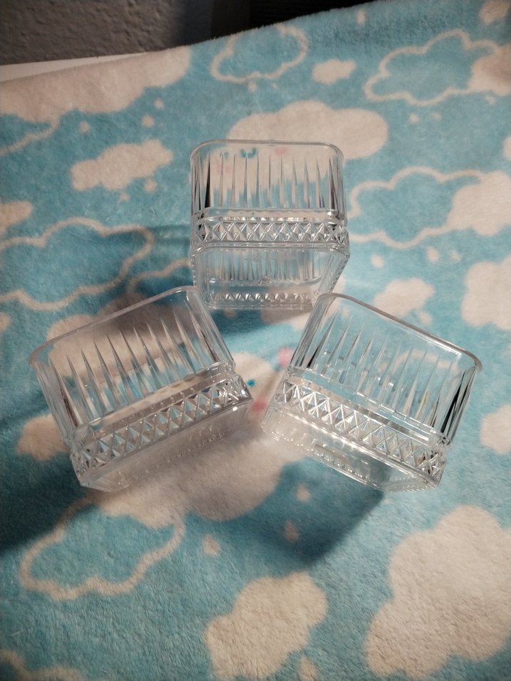Dikey ve elmas desenli şeffaf cam küçük tabaklar, zemin üzerinde. Servis veya dekorasyon için uygundur. ️3 adet fiyatıdır