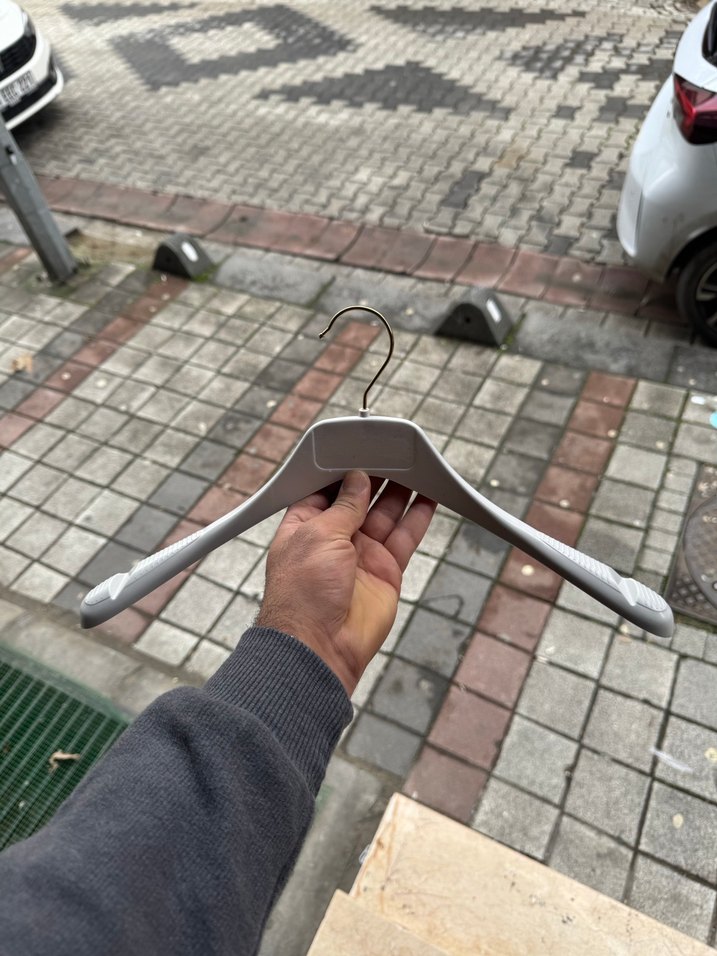 Adet fiyatı 4 TL Gri plastikten yapılmış, metal kancalı askı. Giysileri sağlam tutmak için tasarlanmıştır.