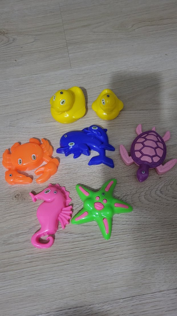 Renkli plastik deniz canlıları oyuncak seti; yengeç, yunus, kaplumbağa, denizatı, denizyıldızı ve iki sarı ördek içerir. havuz deniz oyuncakları ustlerindeki vida sayesinde mıknatıslı olta ile yakalanabilir.