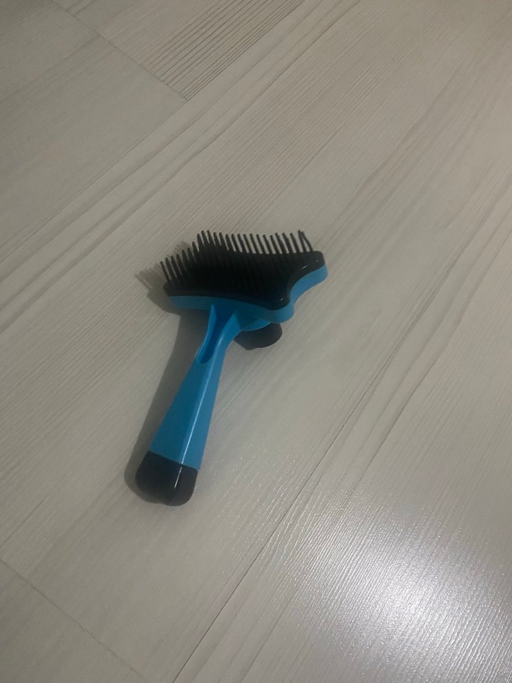 Parlak mavi renkte, kedi tüylerini nazikçe açmaya yardımcı olan tarak. Rahat tutuşlu sapı ve ince dişleri bulunur.