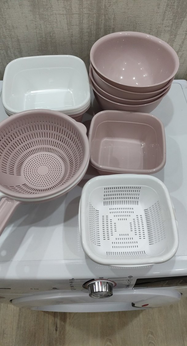 Çeşitli boyutlarda beyaz ve açık pembe plastik mutfak kaseleri ve süzgeçleri seti. ️küçüklerin tanesi 10 büyükler 15 tl. bim hobby life marka