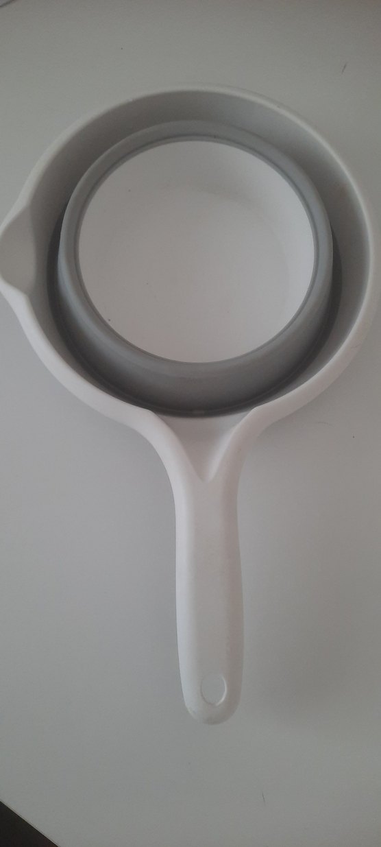 Beyaz ve gri renklerde plastik katlanabilir süzgeç