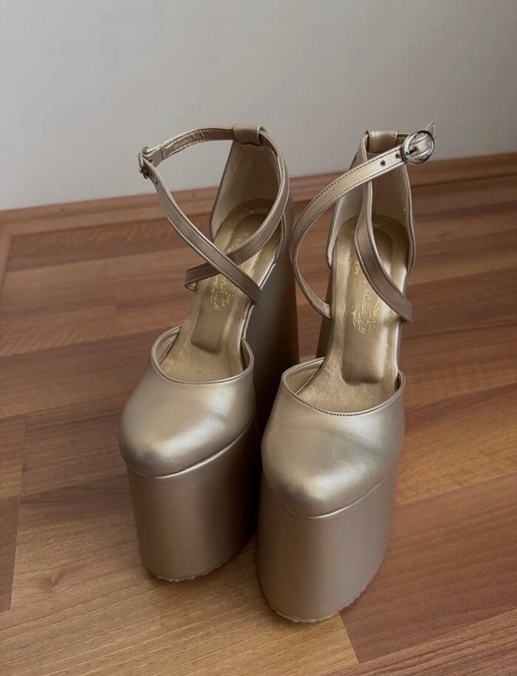 Hiç giyilmedi sıfır ürün herhangi bir sıkıntısı yoktur ağır değildir. Topuk boyu 18 cm Platform 10,5 cm Platform Ayakkabı Yüksek topuk ayakkabı Abiye Ayakkabı Gold Ayakkabı Altın Ayakkabı