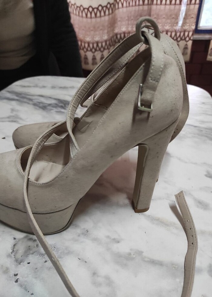 Bir kez kullanıldı yaklaşık 10 cm topuğu var. Platform olmasına rağmen çok rahattır. 38 no uzerindekiler leke değil toz dolapta beklediği için tozlandi. Aldığım fiyat 1200 tl