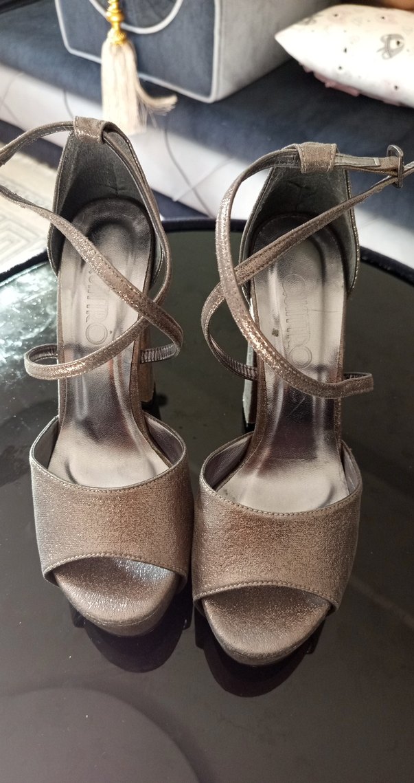 platform yüksek topuk ayakkabı kahve tonlarında hafif parlak sadece düğünumde 1 kere giydim hiçbir deformesi Yok 37 numara tam kalıp