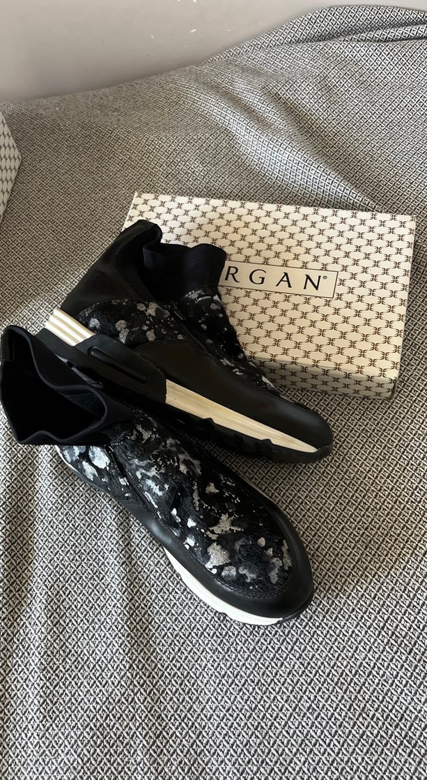 Siyah renkli, baskılı desenli kadın sneakers ayakkabı, platform topuklu ve bağcıklı tasarıma sahiptir. Tabanı dayanıklı kauçuk malzemeden üretilmiştir. İn