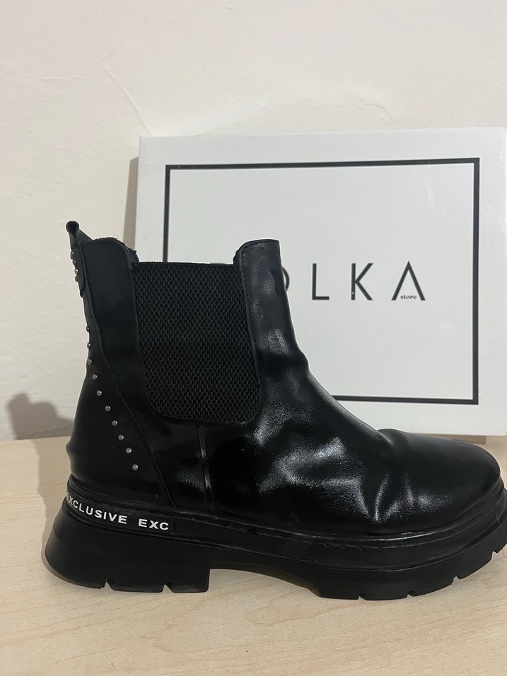 Parlak desenli siyah deri platform topuklu bot, elastik yan detaylı ve LKA marka. Günlük kullanım için uygun. 38”39 numaraya